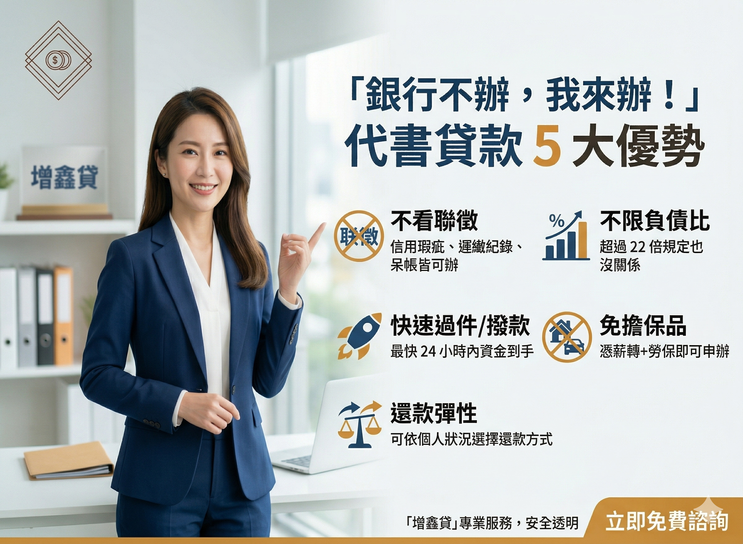 您是否正遇到:想創業周轉、急需醫療費或是要清償高利卡債,卻因為聯徵次數過多、薪轉證明不足,或是負債比超過 22 倍而被銀行狠心拒絕? 當銀行的門關上時,「代書貸款」(民間信用