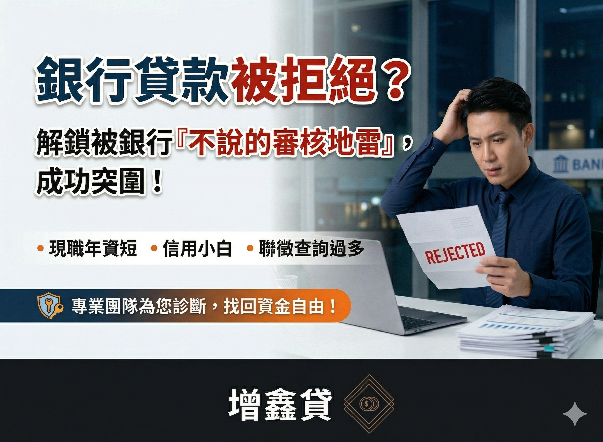 一、 為什麼貸款總是被拒絕?常見的 3 大原因 很多客戶在申請貸款時,常因為以下原因踢到鐵板: 信用評分不足:曾有遲繳紀錄或信用卡預借現金。 負債比過高:名下債