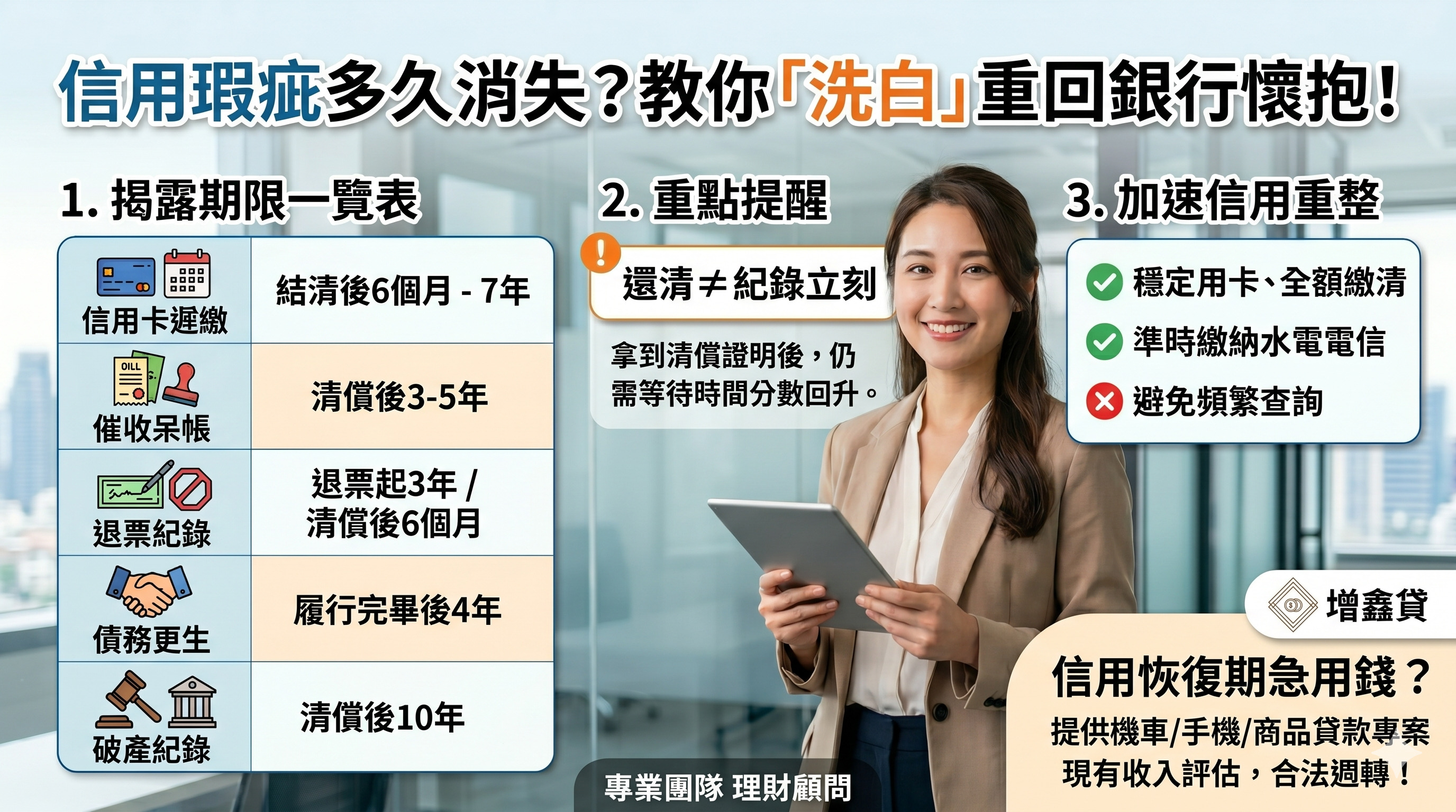 很多客戶問:「我以前信用卡遲繳過,難道這輩子都不能跟銀行借錢了嗎?」答案是:不會! 信用紀錄是有「揭露期限」的。只要時間一到,紀錄就會塗銷,但前提是你必須知道各類瑕疵的「有效期限」。