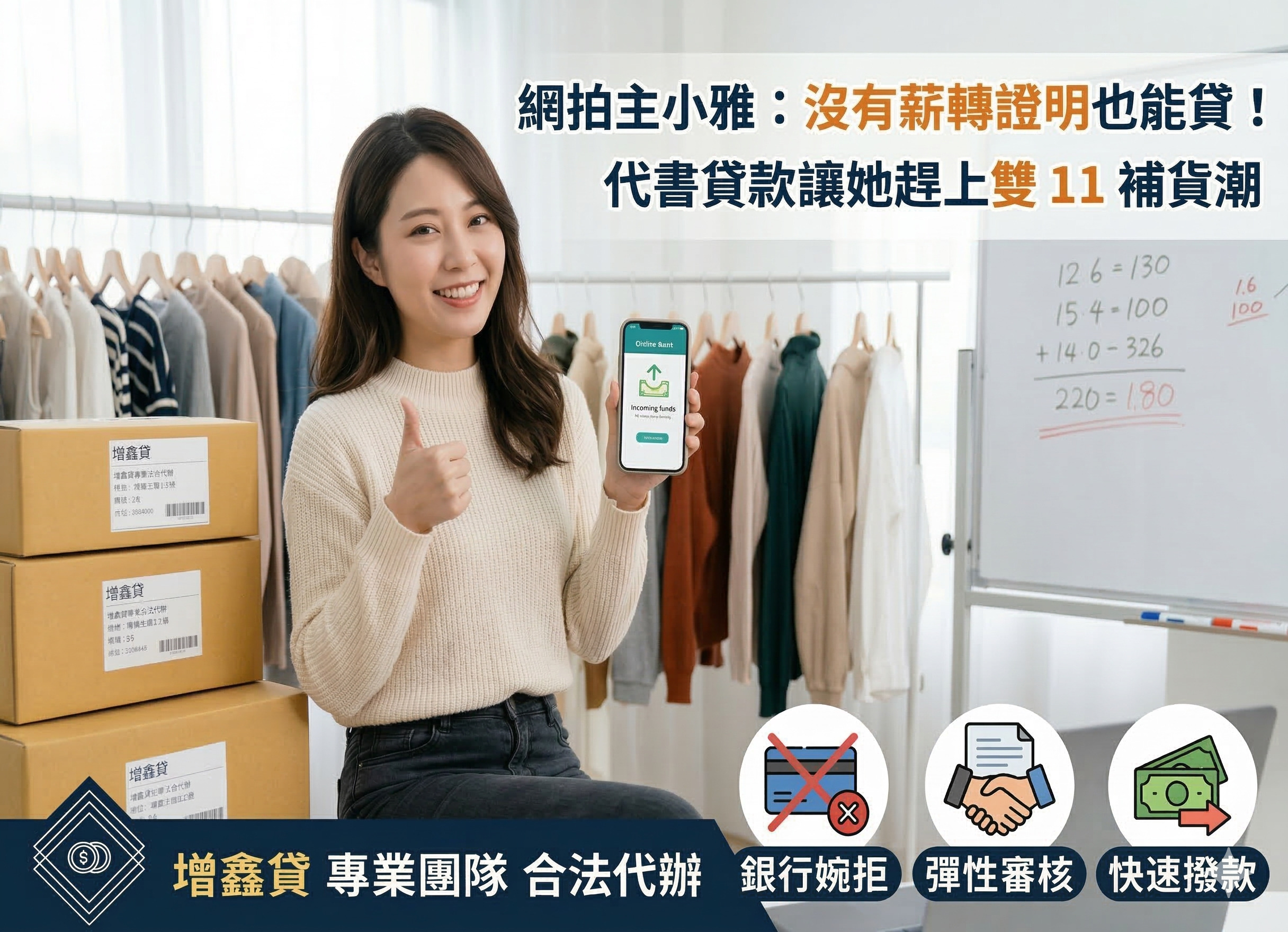 小雅經營個人服飾網拍,雖然營收穩定,但因沒有勞保薪轉,被銀行判定為「信用小白」拒絕貸款。面對旺季需 10 萬補貨金,她找上增鑫貸。