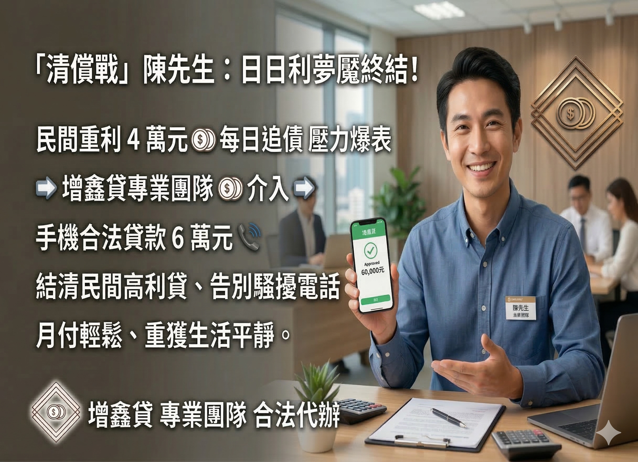 陳先生被民間重利壓得喘不過氣。我們介入後,建議他利用手機辦理 6 萬元合法貸款,幫他結清民間高利債務。現在他每天不用再接騷擾電話,月付金降到能夠喘口氣,終於找回平靜的生活。